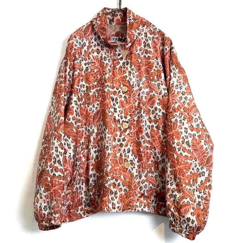 グレーのレオパード柄の上にブラウンのボタニカル柄がオーバープリントされたカモフラージュっぽくも見えるユニークな1枚