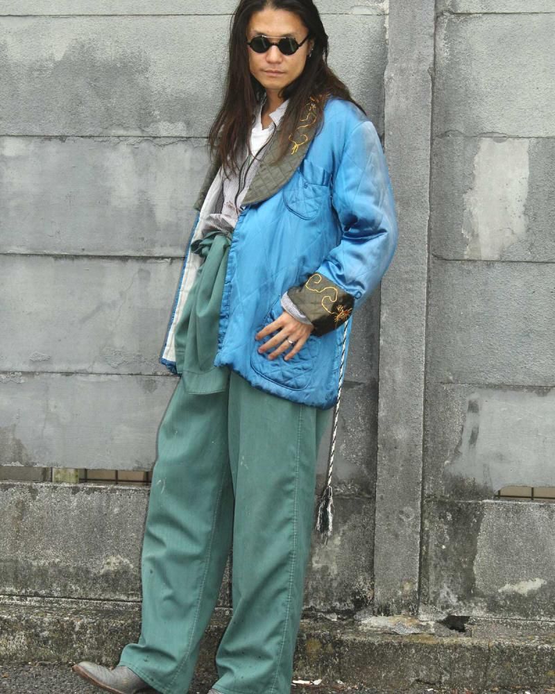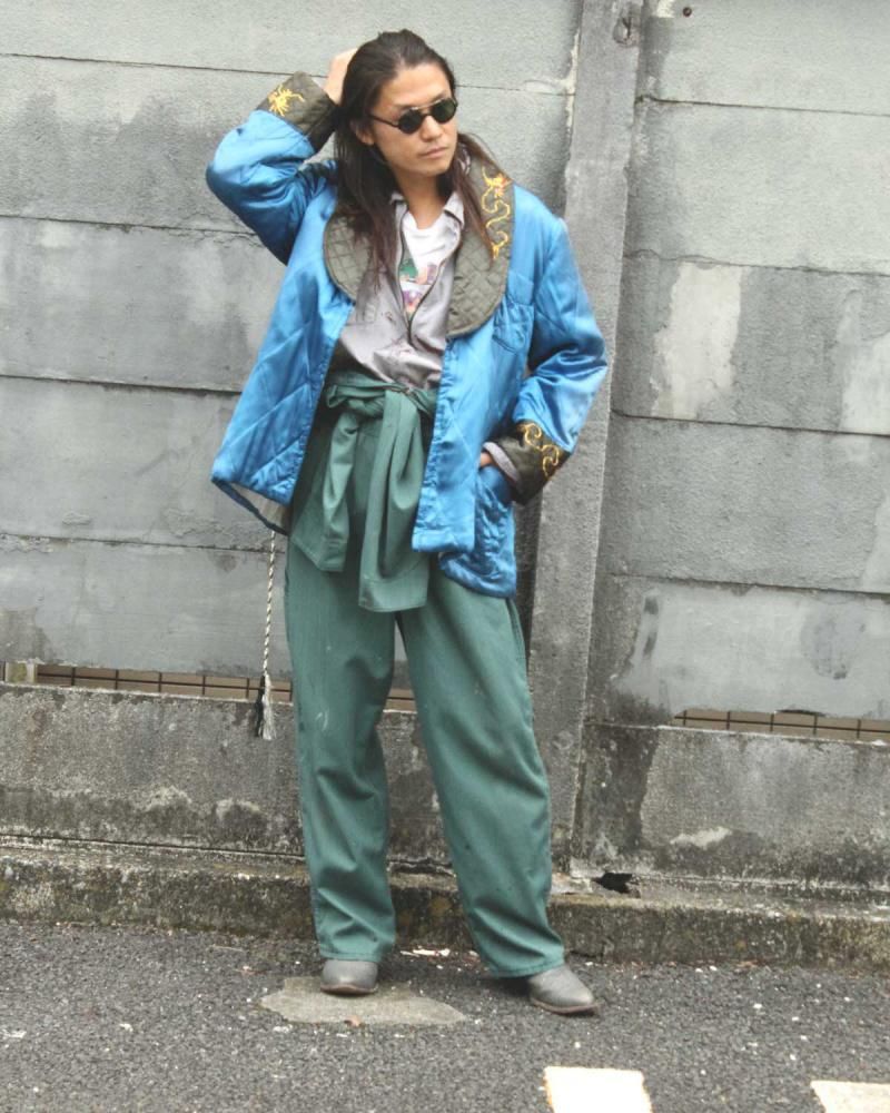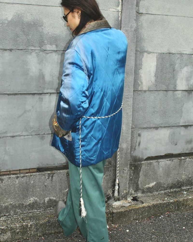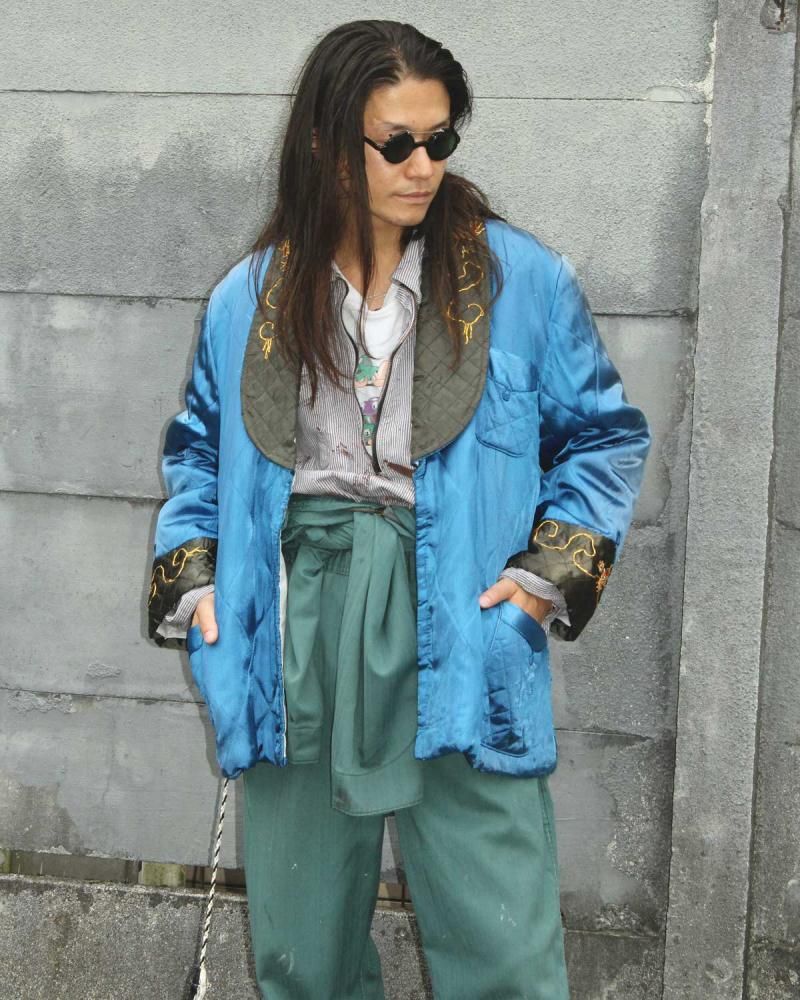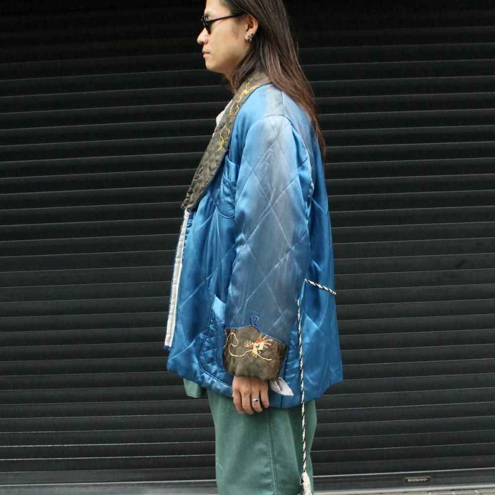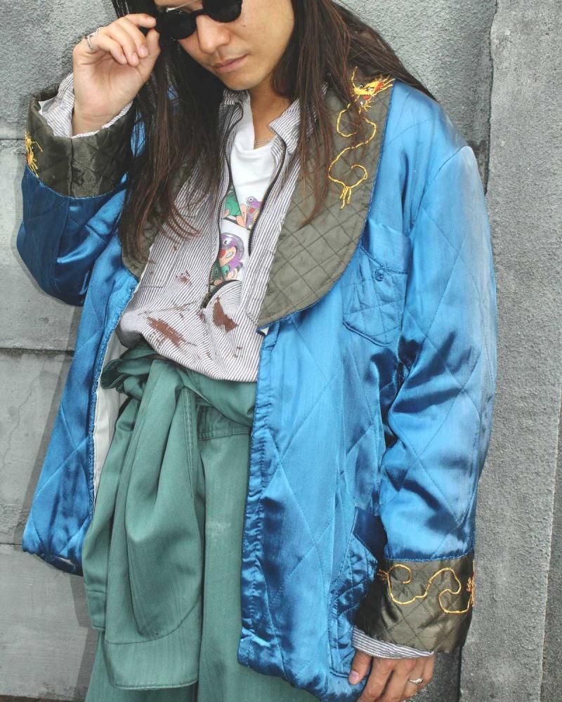 全体の印象を締めるブラックの生地にワイヤーの金糸でさり気なくドラゴンの刺繍が施されておりレーヨン生地も相まってよりスーベニアジャケット感の強い個体です。