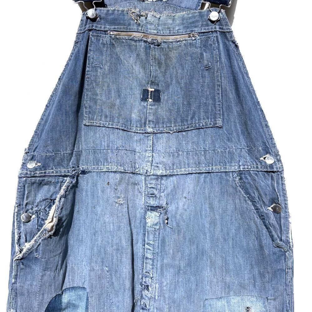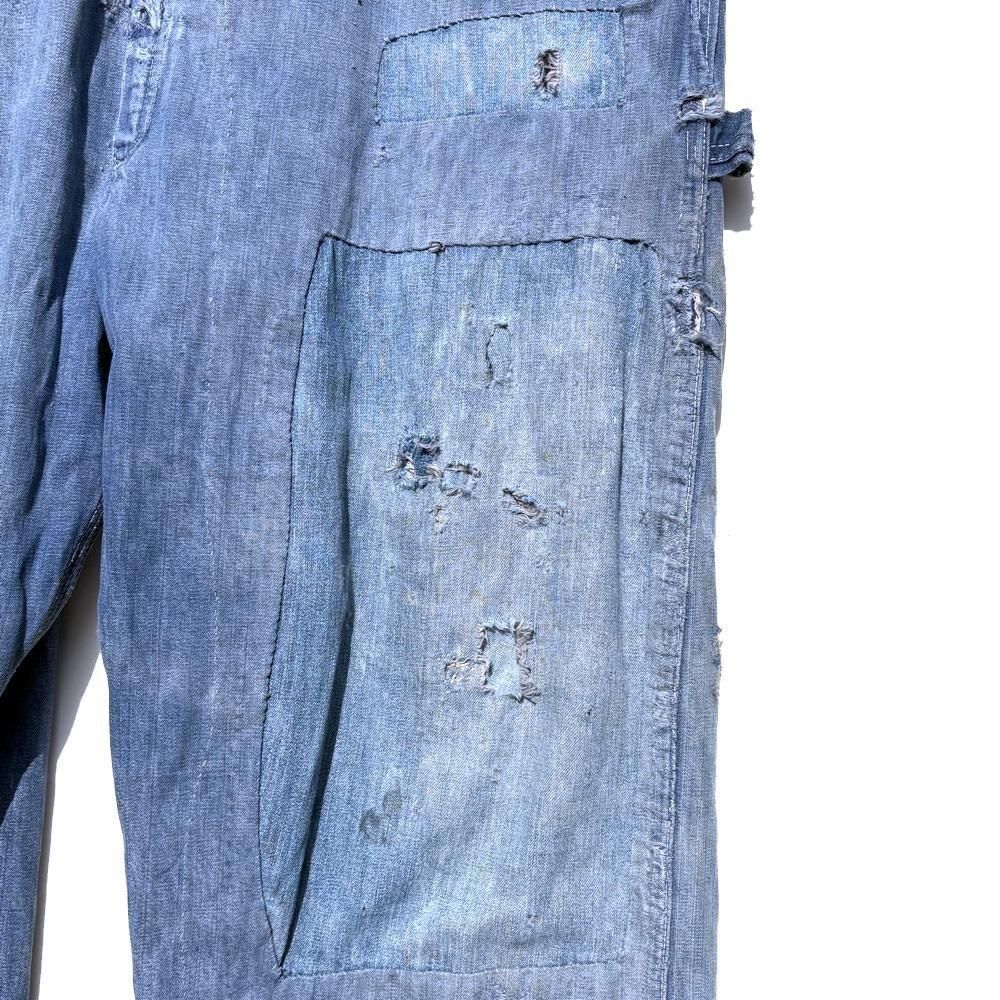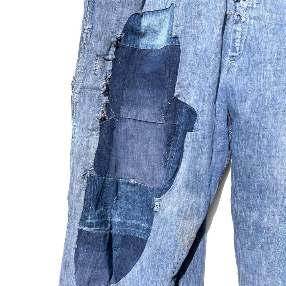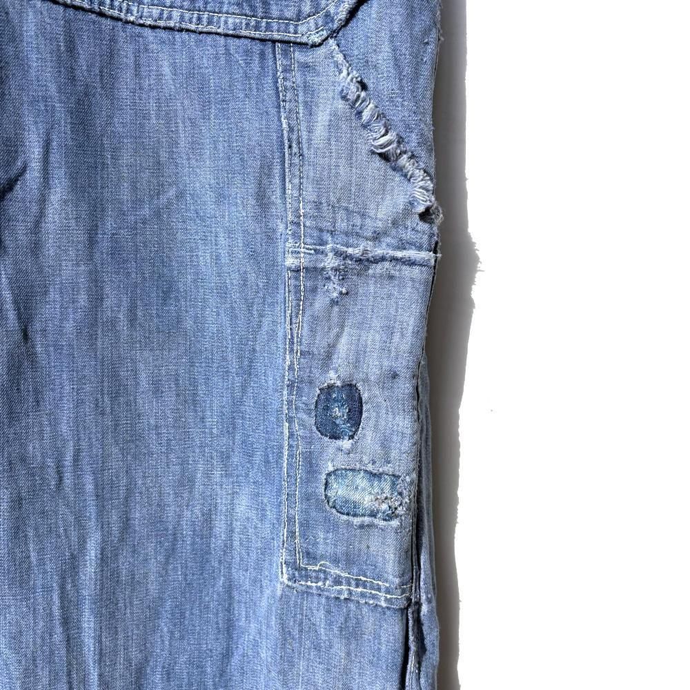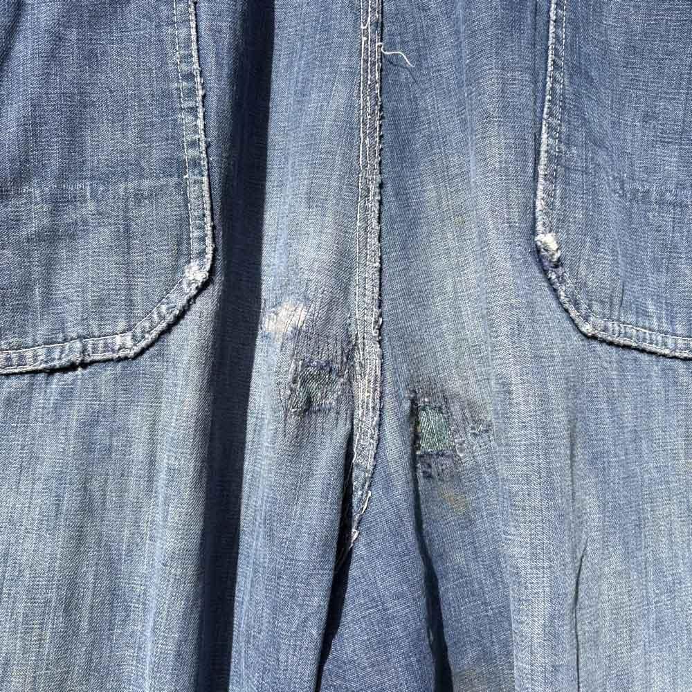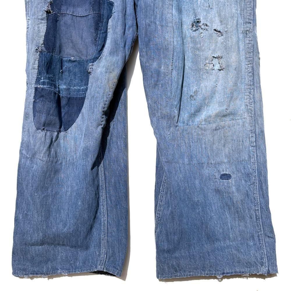 経年で生地も柔らかくなっており軽やかな質感、色味の残ったインディゴに程よいアタリが見えるヴィンテージならではのデニム生地、ダメージやリペア跡がある種アーティスティックな表情で唯一無二の存在感放つスペシャルピース。