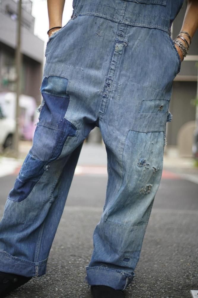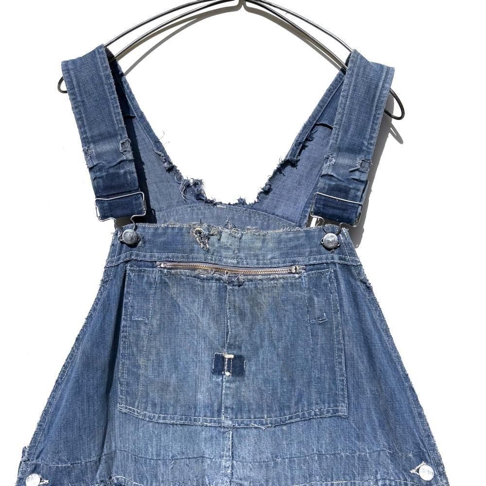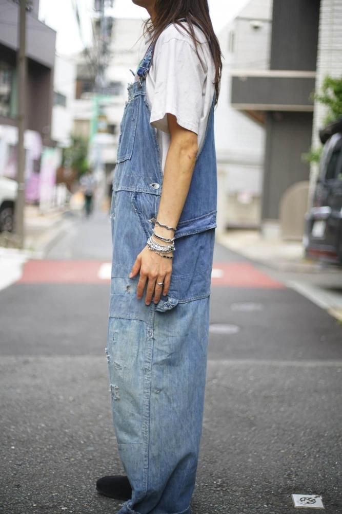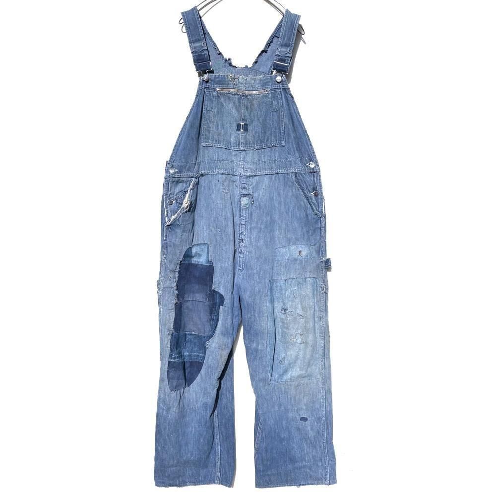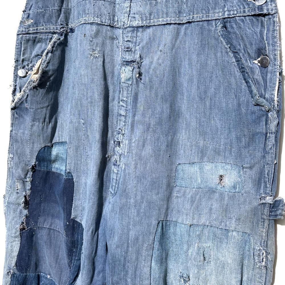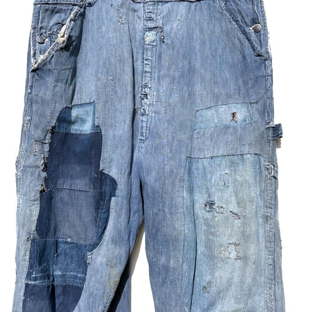経年で生地も柔らかくなっており軽やかな質感、色味の残ったインディゴに程よいアタリが見えるヴィンテージならではのデニム生地、ダメージやリペア跡がある種アーティスティックな表情で唯一無二の存在感放つスペシャルピース。