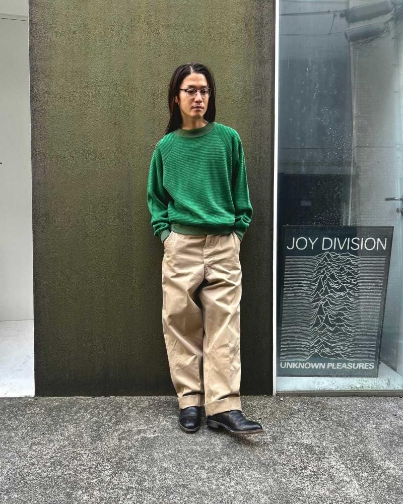 アクリル/レーヨン素材の柔らかなボディと細かなストライプパターンがレトロな60~70年代に見られる特徴的なアイテム。