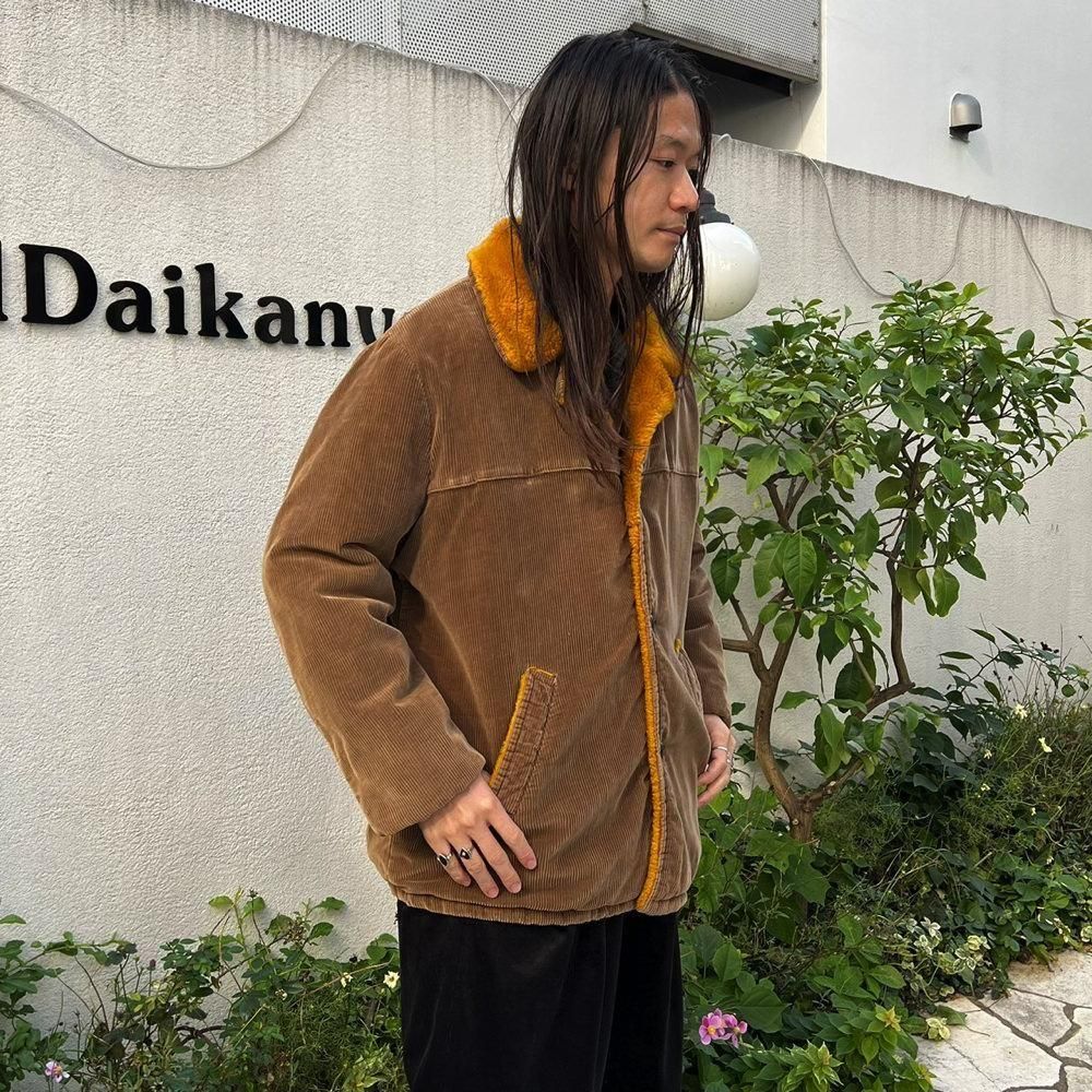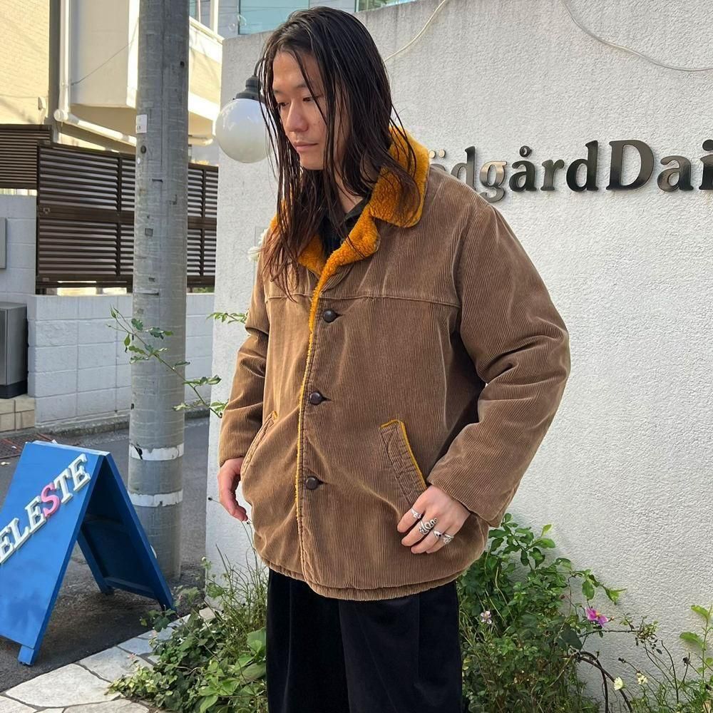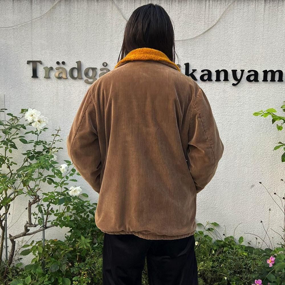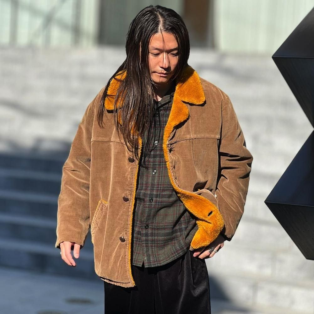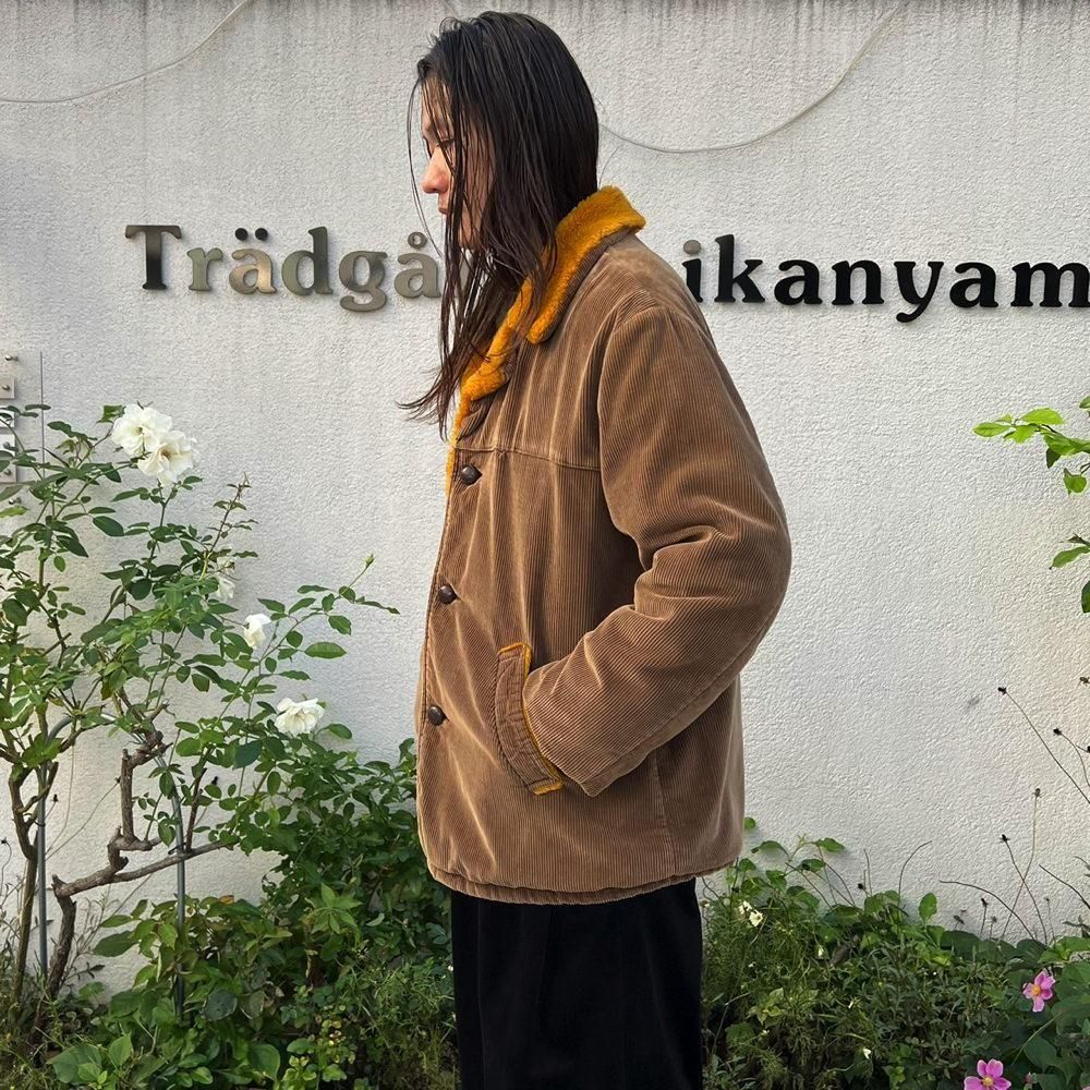 風合い良く色褪せたモカブラウンカラーのコーデュロイにマスタードカラーのボアが味のある土っぽい雰囲気な1枚