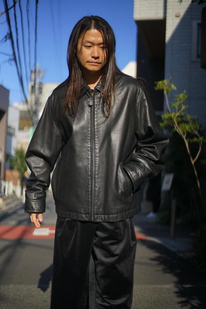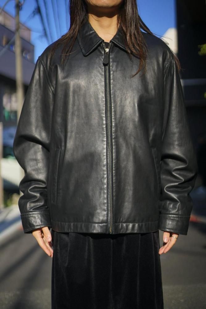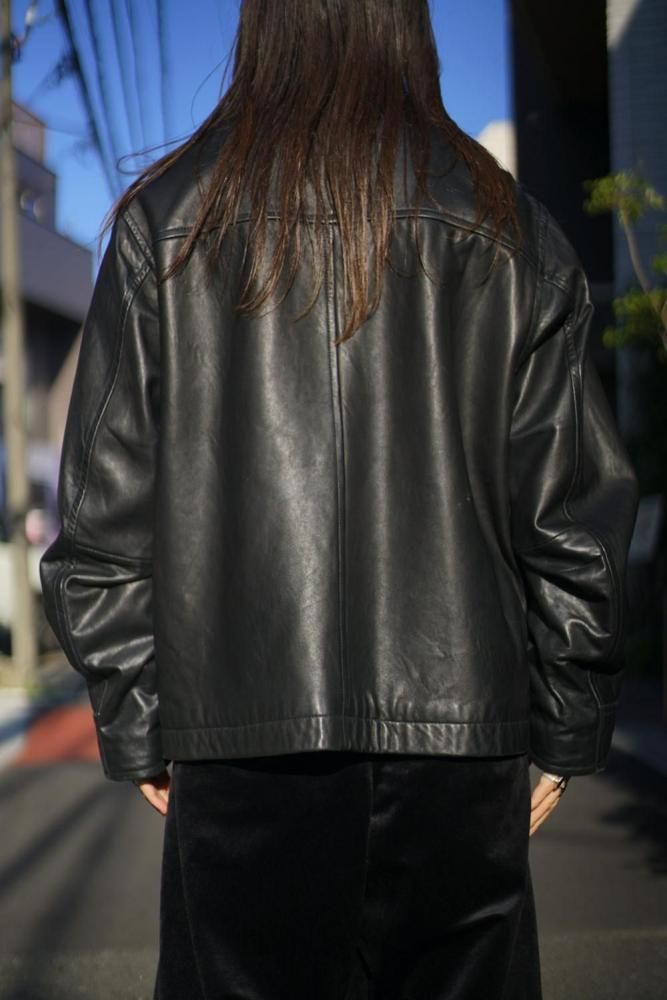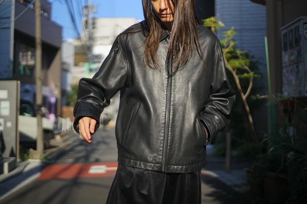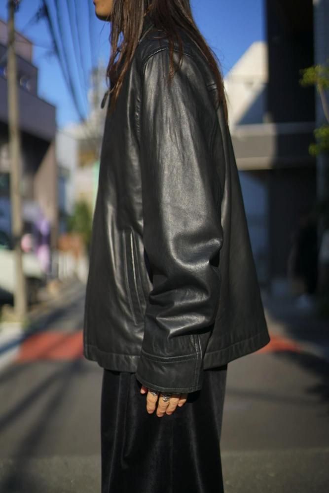 シンプルに纏められたミニマルデザインが高級感のある雰囲気、程よくゆとりのあるシルエット、柔らかに落ちるショルダーライン、リラックス感があり軽やかな印象に見せつつもレザーの重厚感も損なわない表情です。