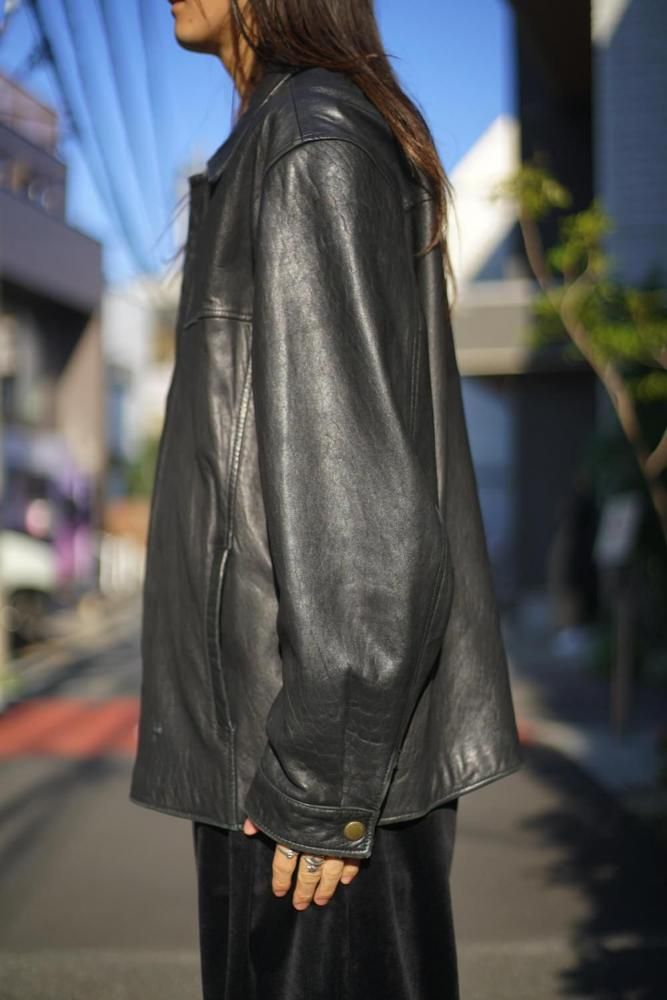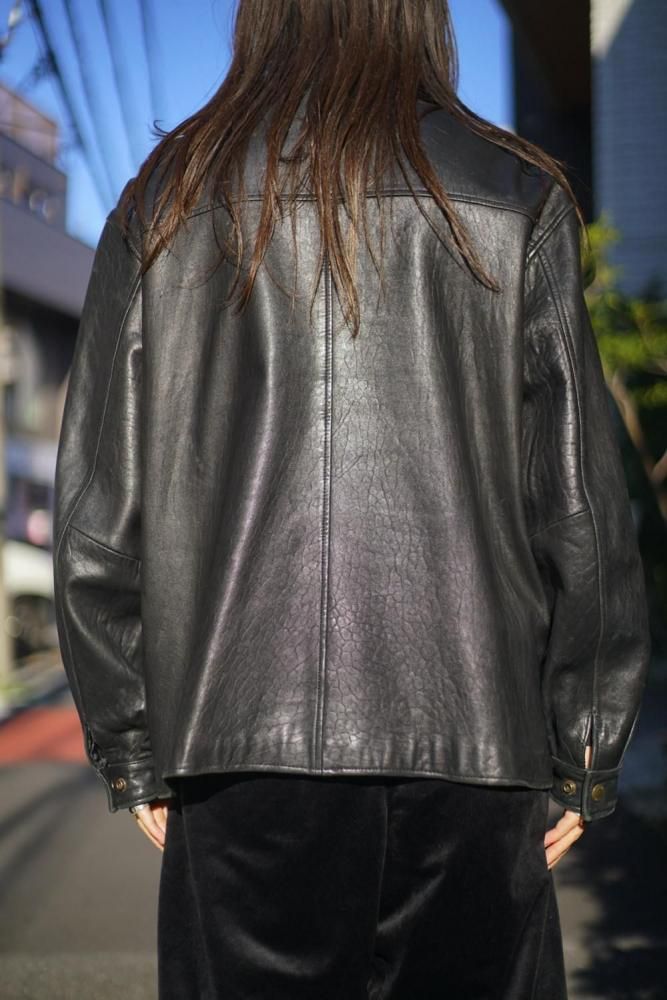 シンプルに纏められたミニマルデザインが高級感のある雰囲気、程よくゆとりのあるシルエット、柔らかに落ちるショルダーライン、リラックス感があり軽やかな印象に見せつつもレザーの重厚感も損なわない表情です。
