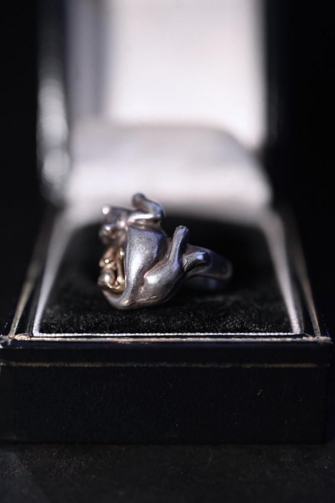 シルバーの猫に、14Kイエローゴールドのネズミが描かれたリング。