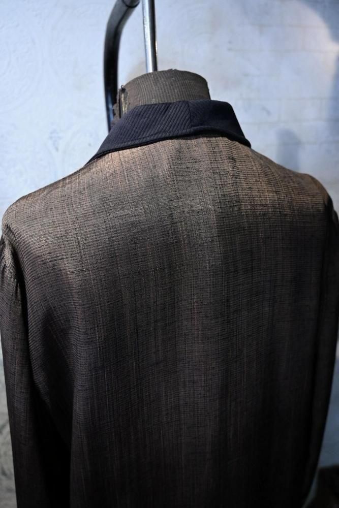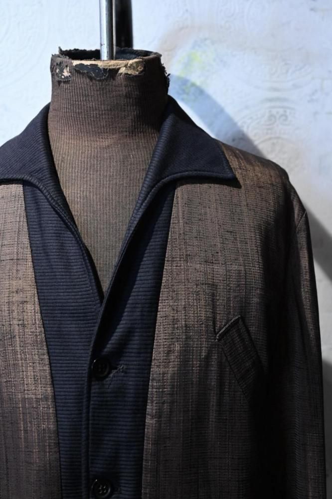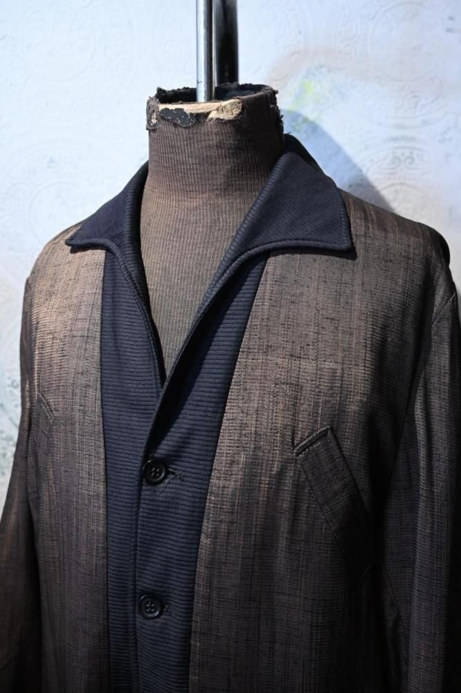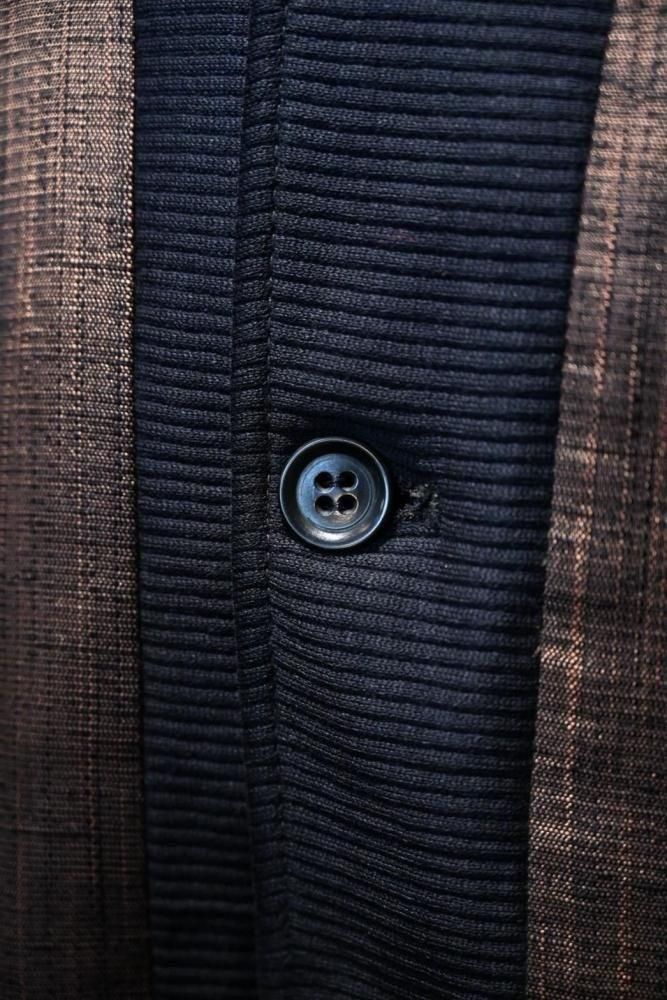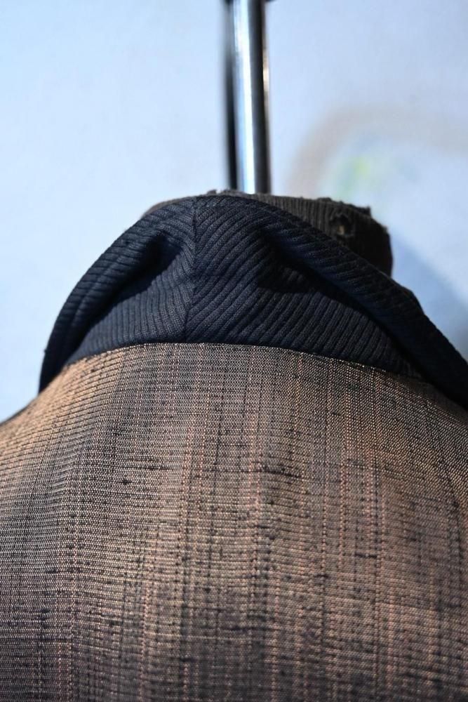 ブラウンの細かくスラブの入ったレーヨンと思われる軽やかな生地に、ブラックのピケのコンビ。