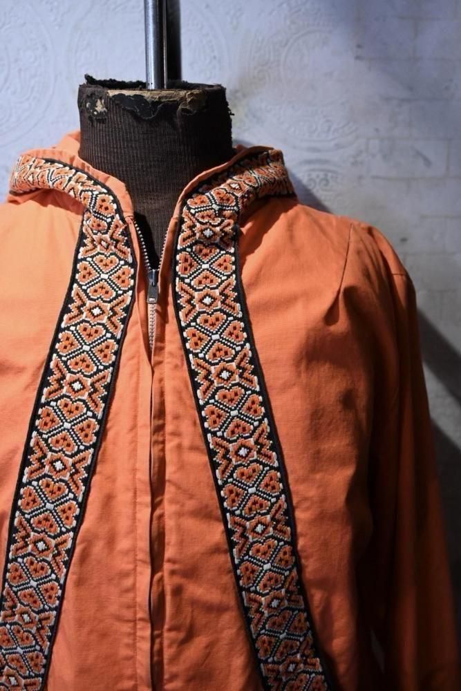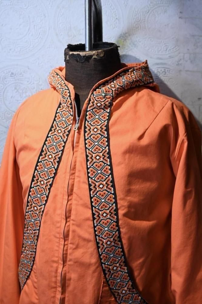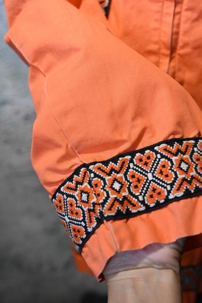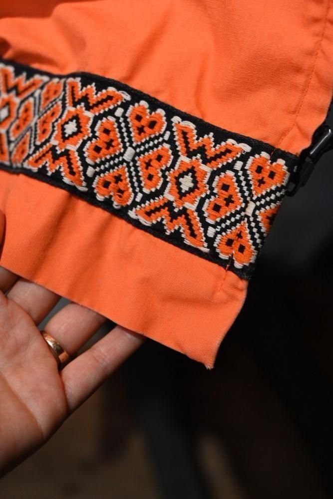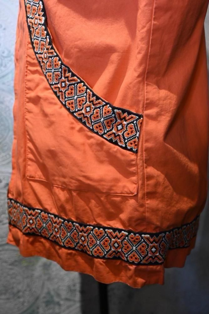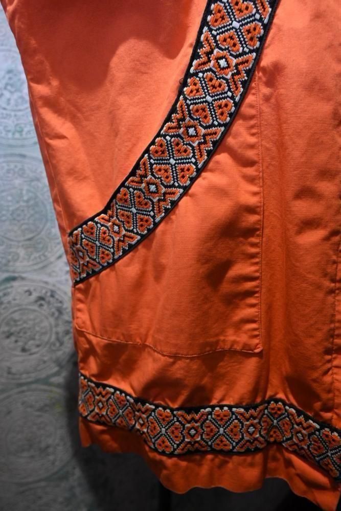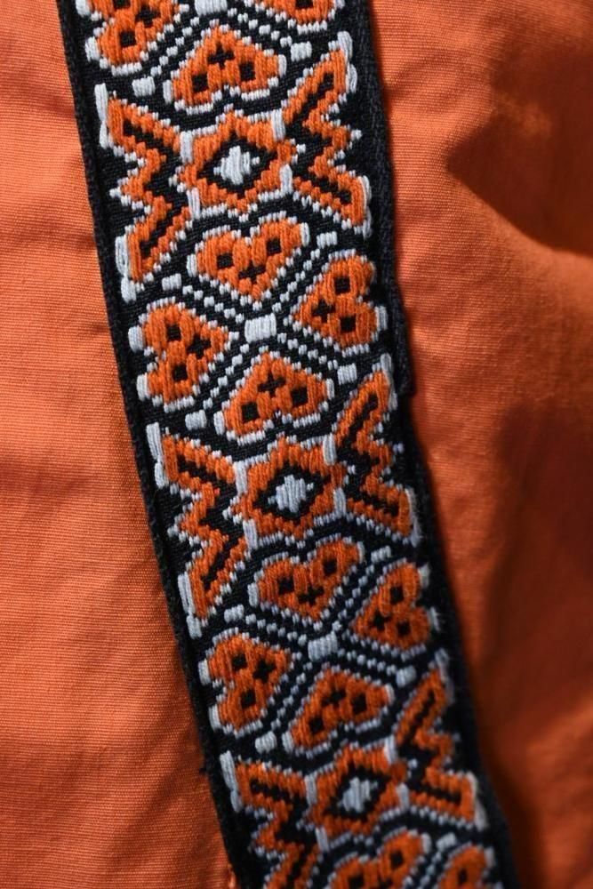 落ち着いたオレンジのコットンのベースに、チロリアン調のテープの組み合わせ。