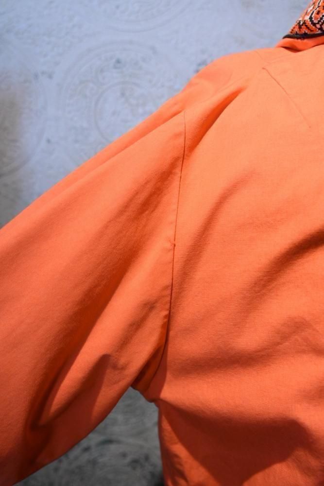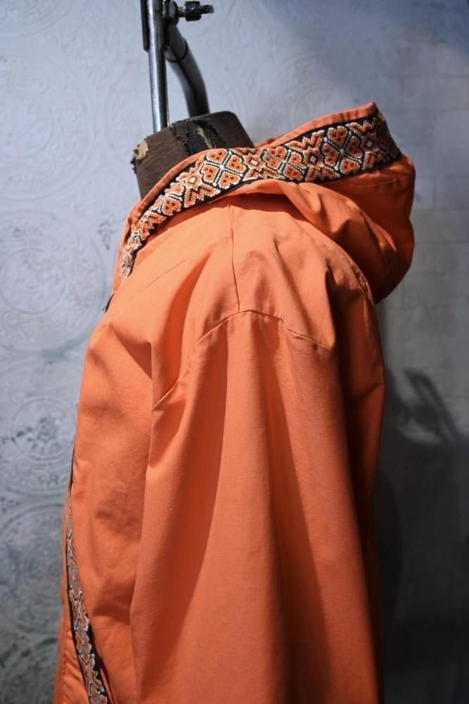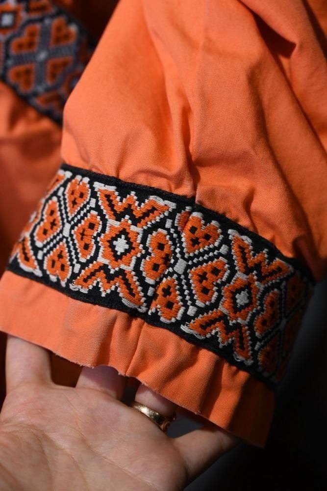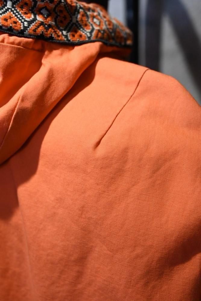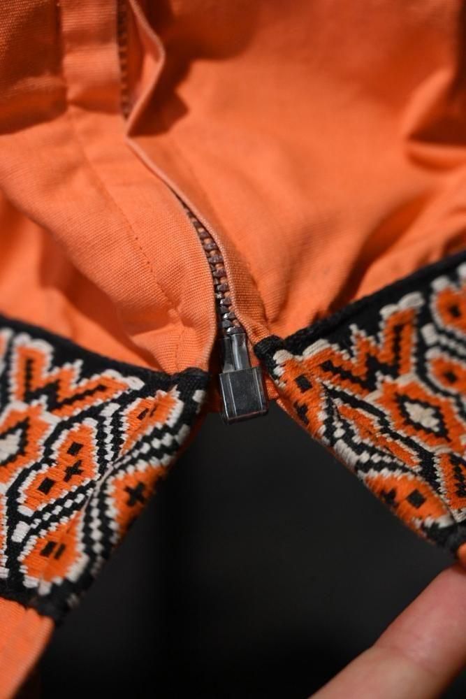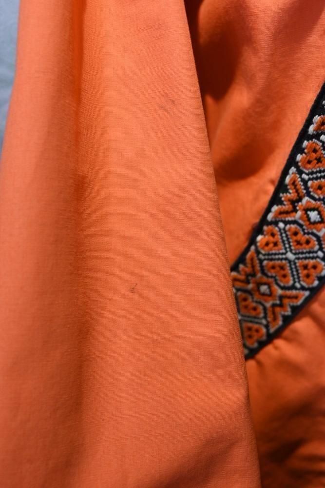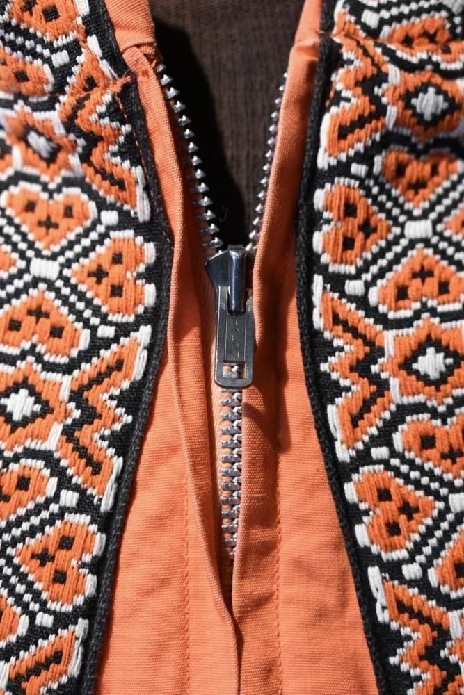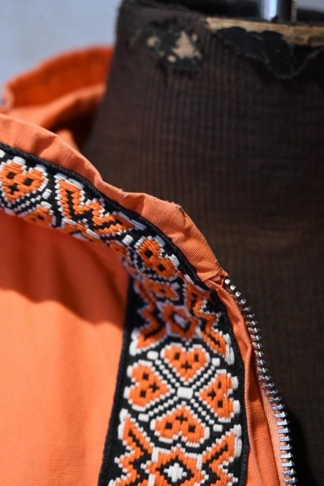 落ち着いたオレンジのコットンのベースに、チロリアン調のテープの組み合わせ。