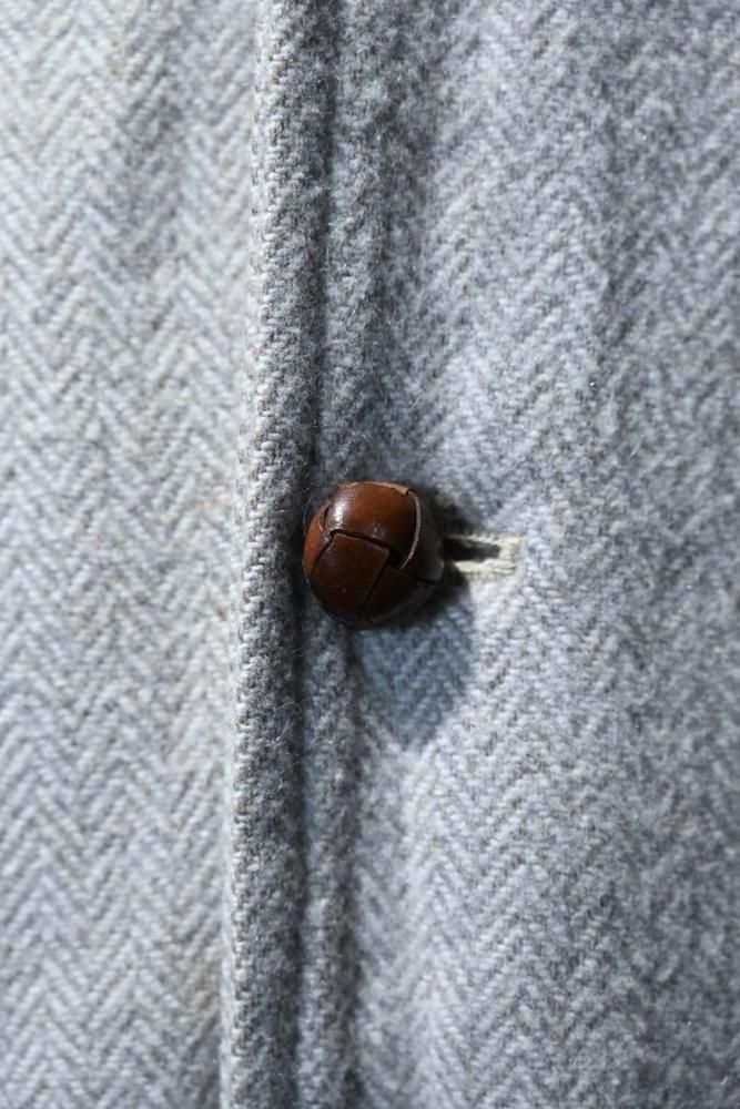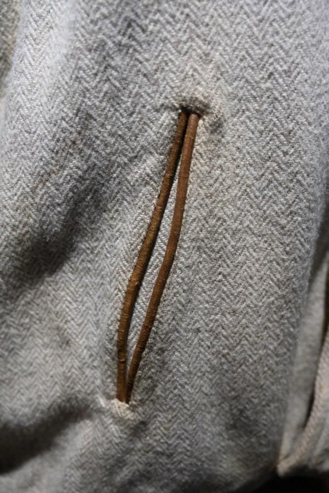 ポケット口のレザーの玉縁とバスケットボタンがいいアクセントになっている。