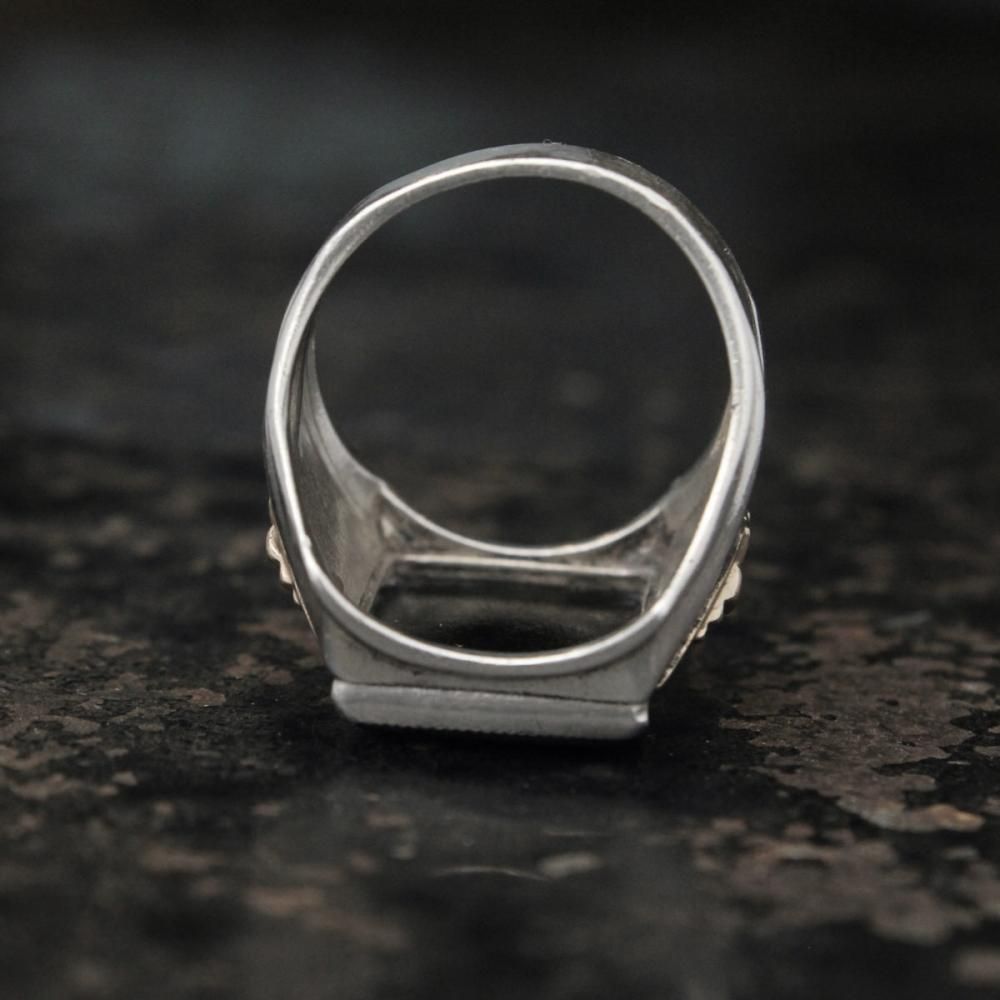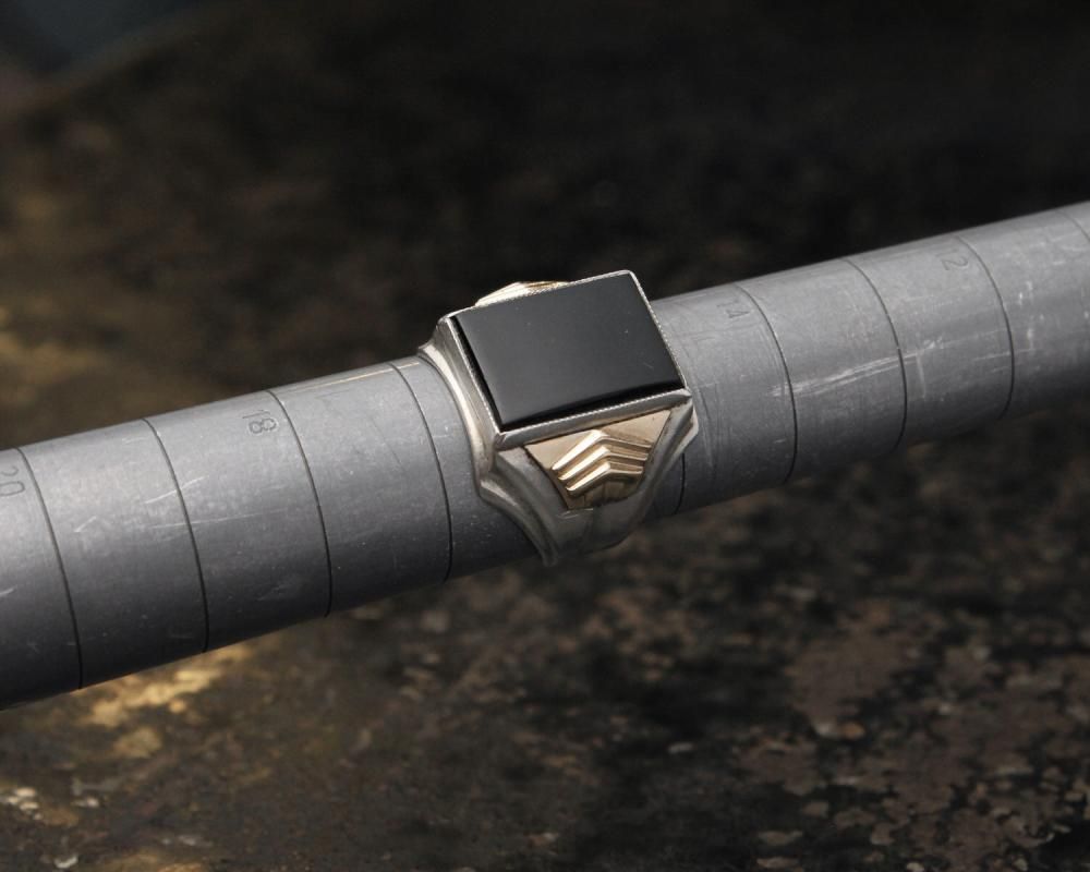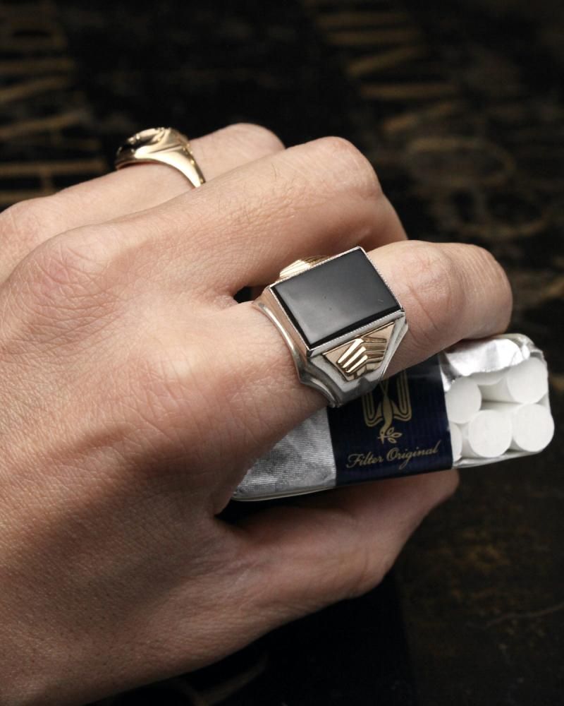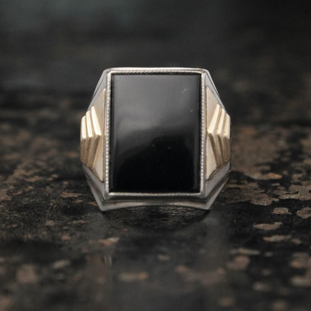 古い年代らしい威厳を見せるスクエア型に大きくオニキスが入ったミニマルなデザイン