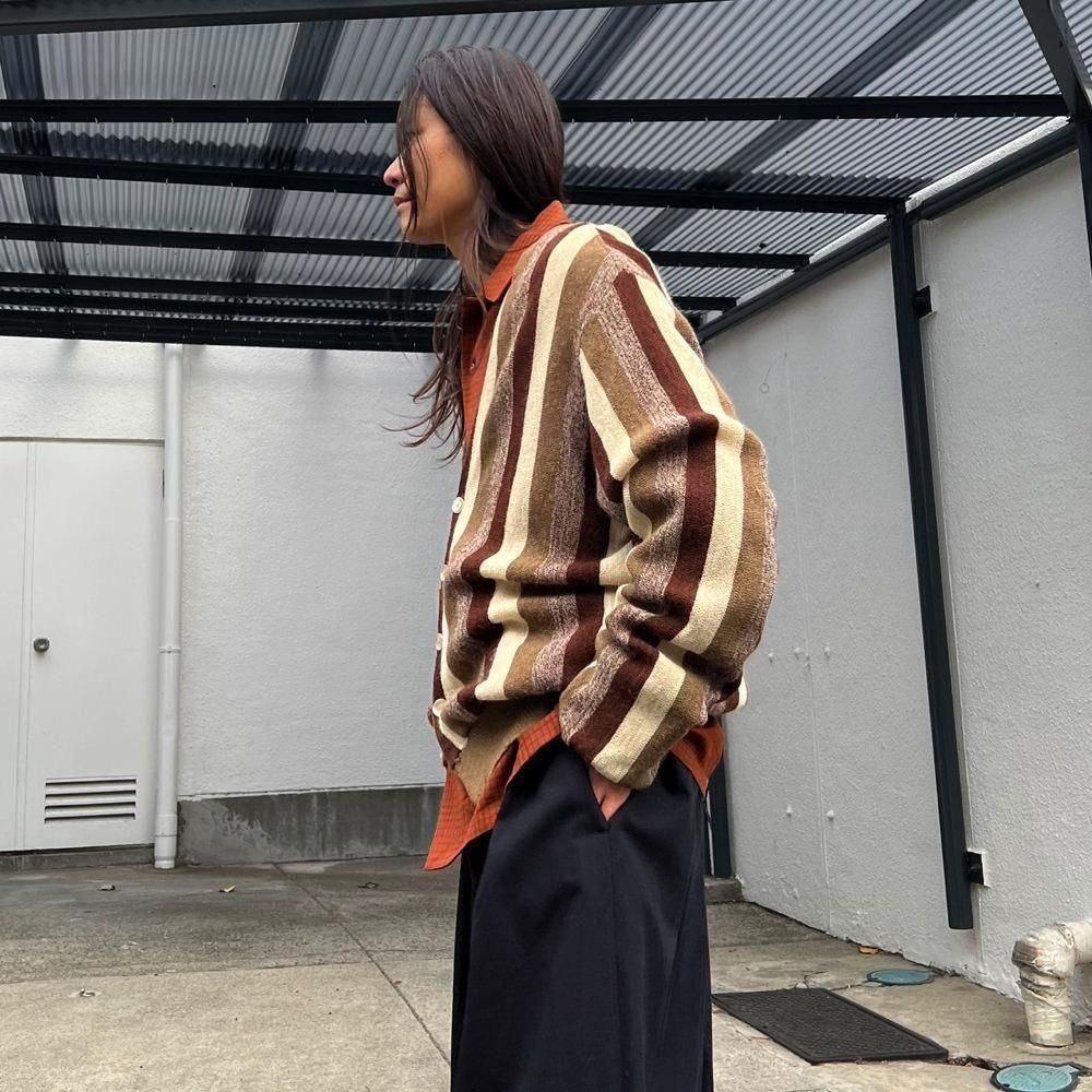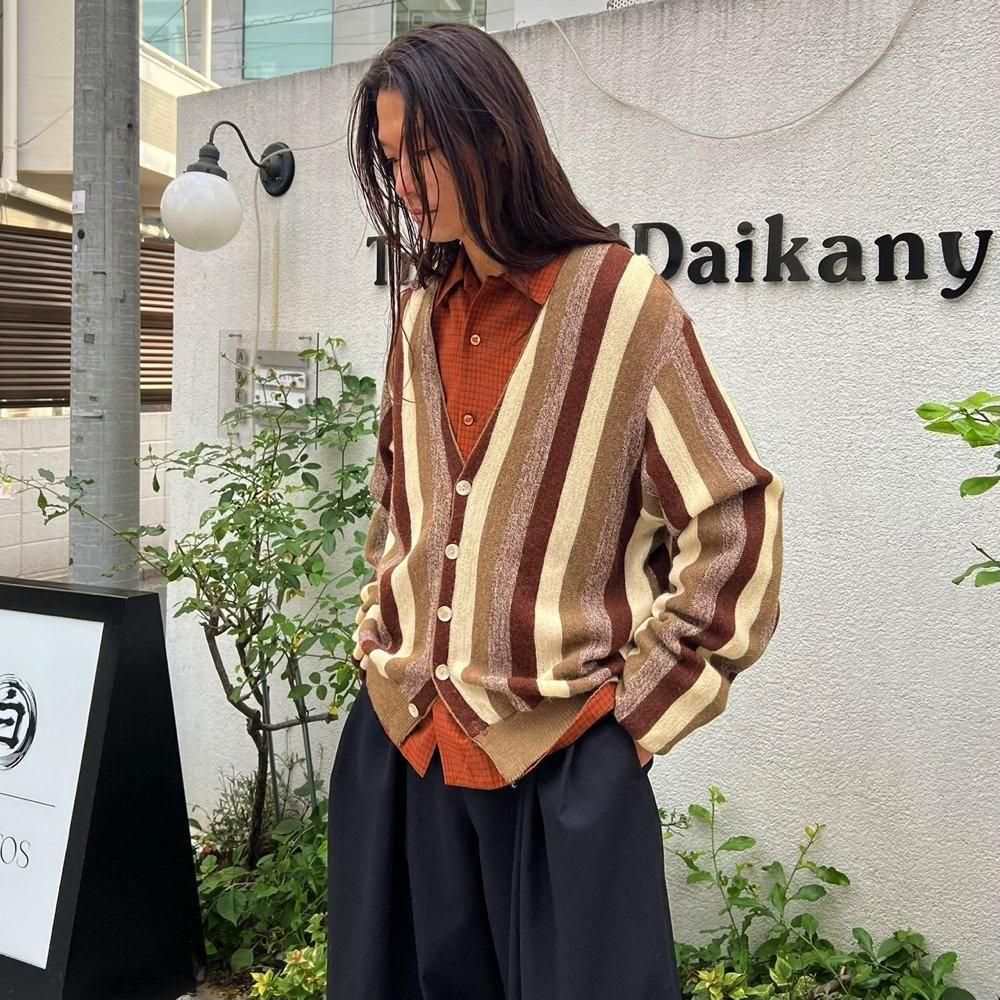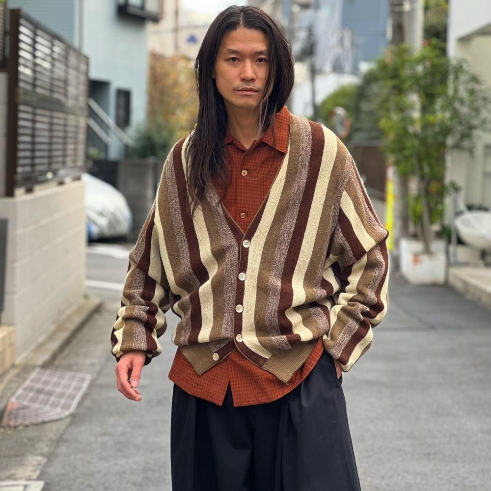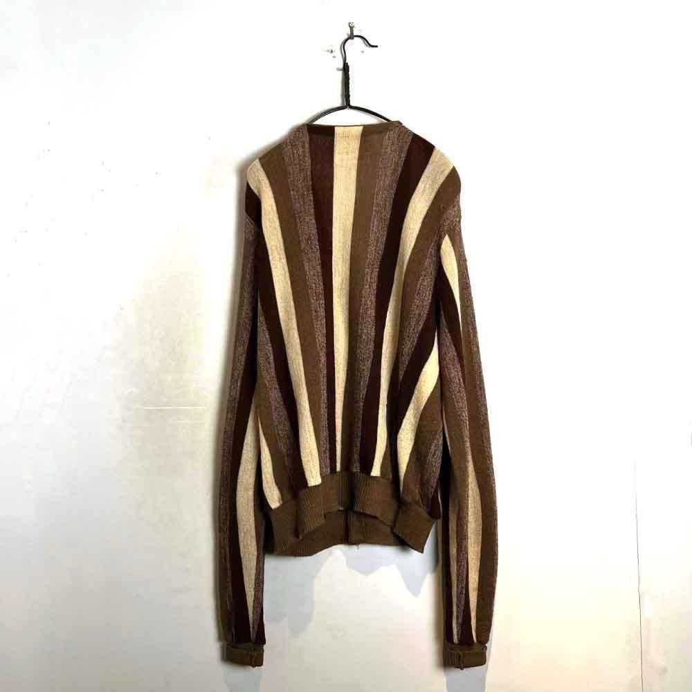 アルパカ混の高品質ニット、ブラウン、ベージュ、カーキのストライプが味わい深い雰囲気の1枚