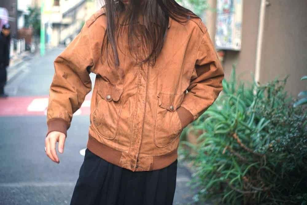 Mサイズの体のアウトラインに沿うように馴染み綺麗なシルエット、ミリタリーのA-2ジャケットとは一線を画する上品さが伺えるユーティリティ性の高い一着。